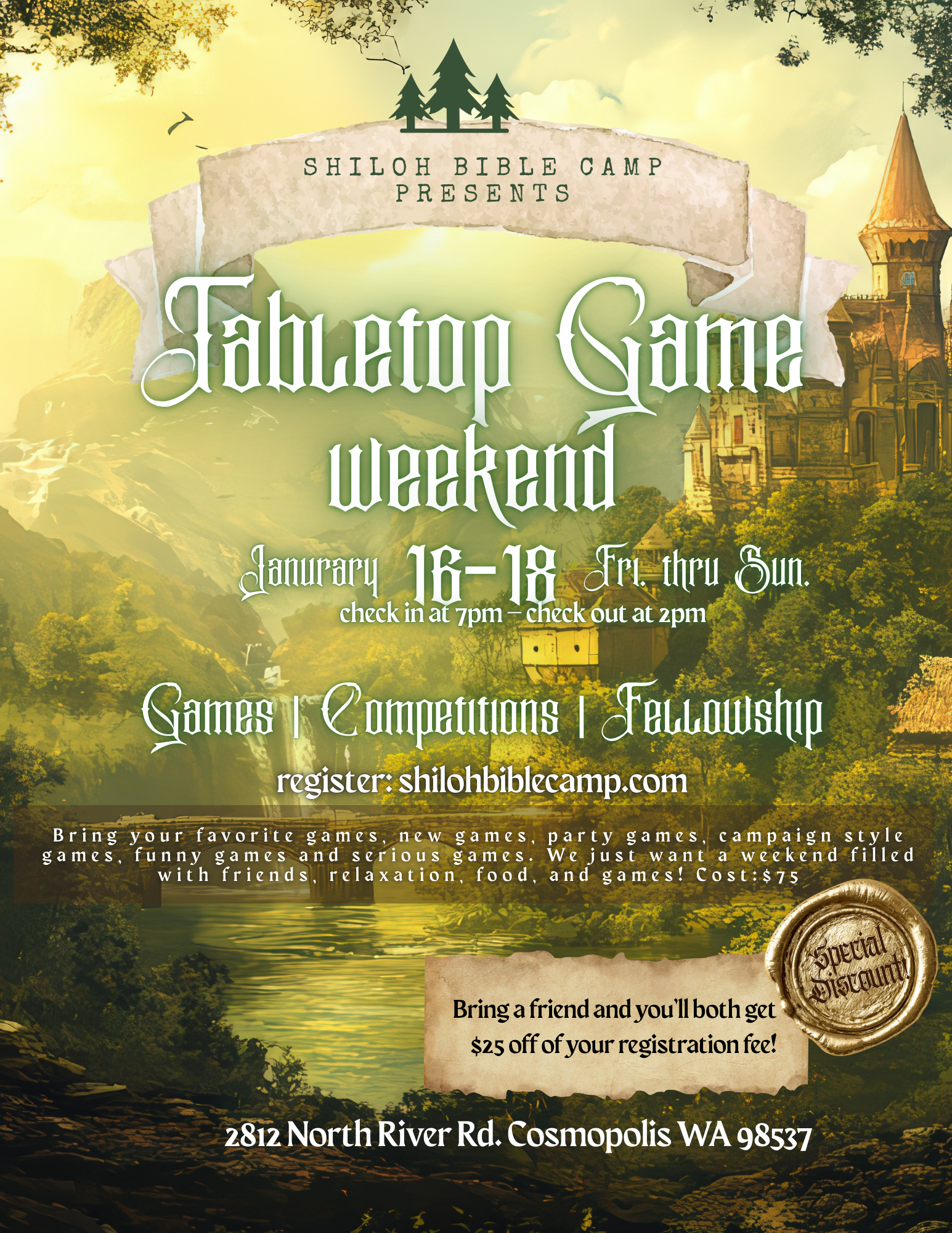 Calling all tabletop gamers! Join us for a weekend of strategy, adventure, and fellowship at Shiloh Bible Camp. Whether you love board games, card games, or role-playing games, this is the perfect chance to connect with fellow gamers in a Christ-centered environment.